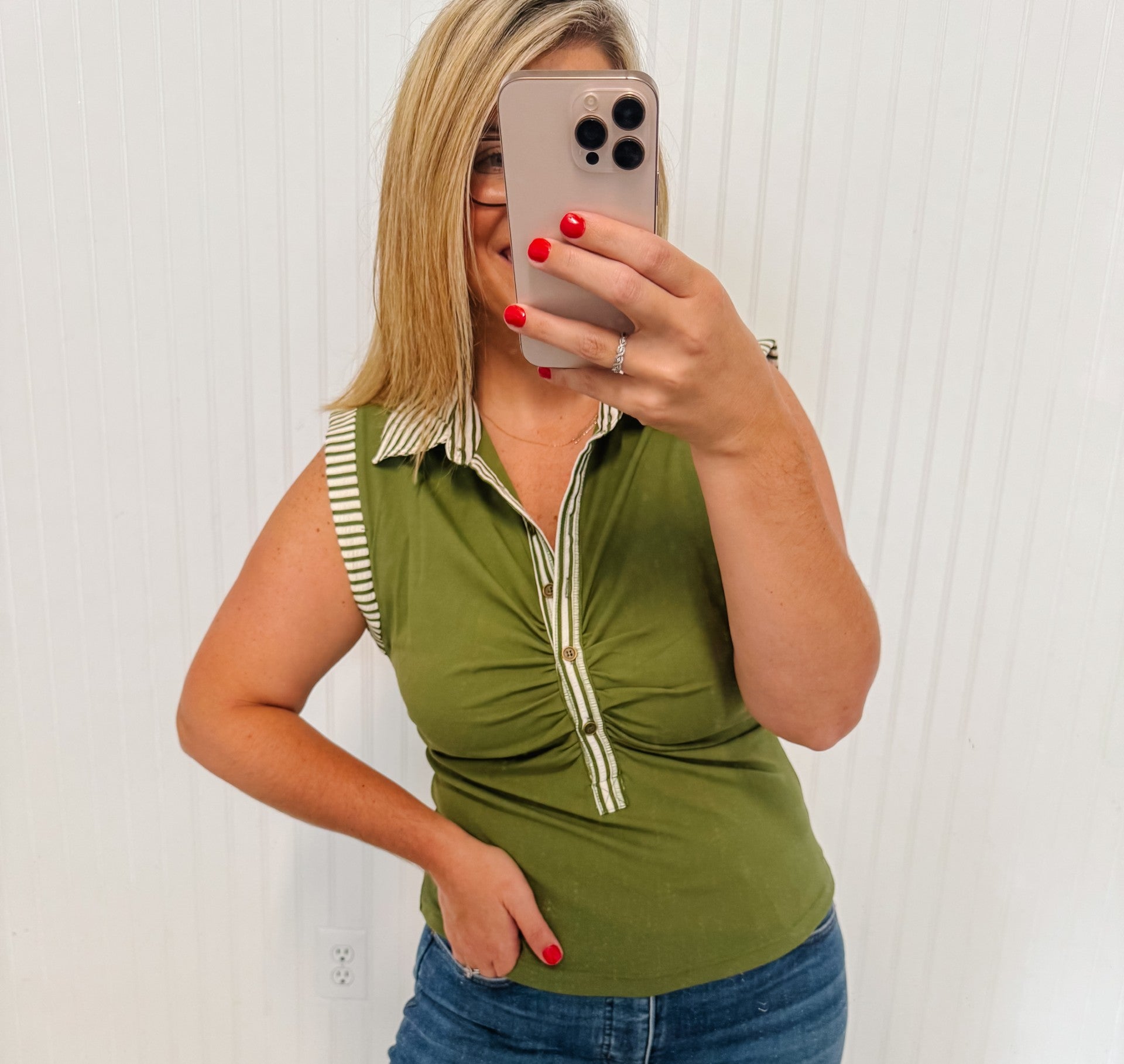 Olive color. Collared. Sleeveless. Samantha is wearing size large. If in between sizes, size up!