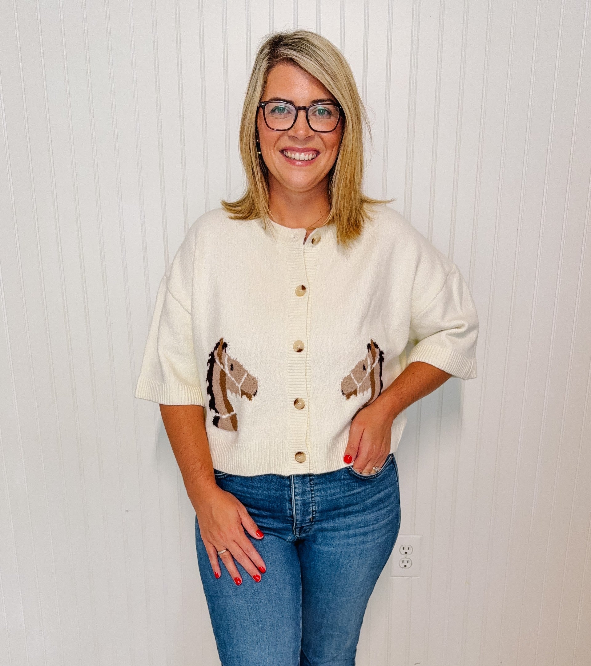 Horse motif short sleeve button-front sweater top featuring ribbed neckline, hem, and sleeve openings. Unlined. Knit. Non-sheer. Medium weight.