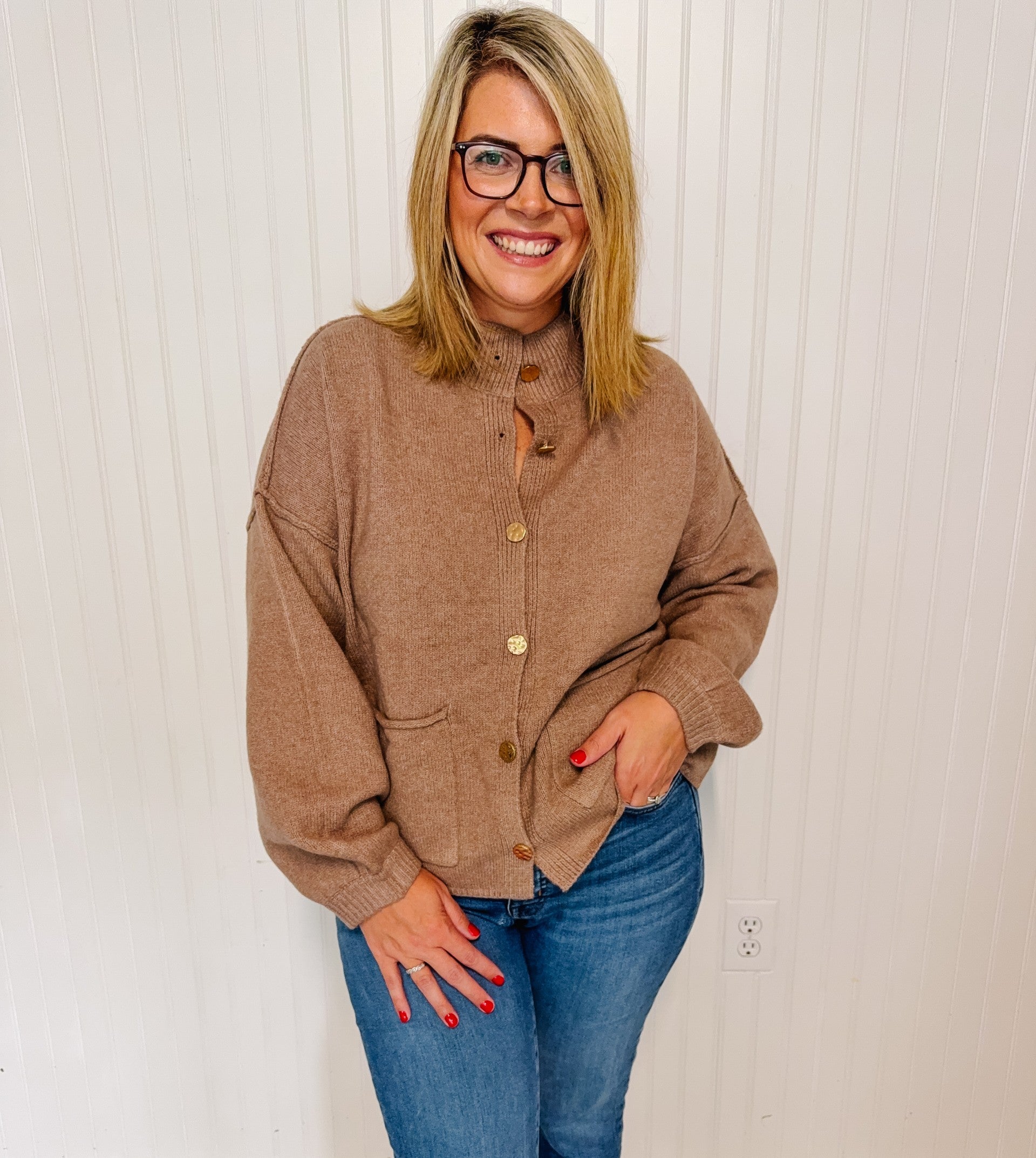 Solid long sleeve knit cardigan featuring mock neck and hammered gold-tone button-front closure. Front pockets. Unlined. Knit. Non-sheer. Medium weight.
