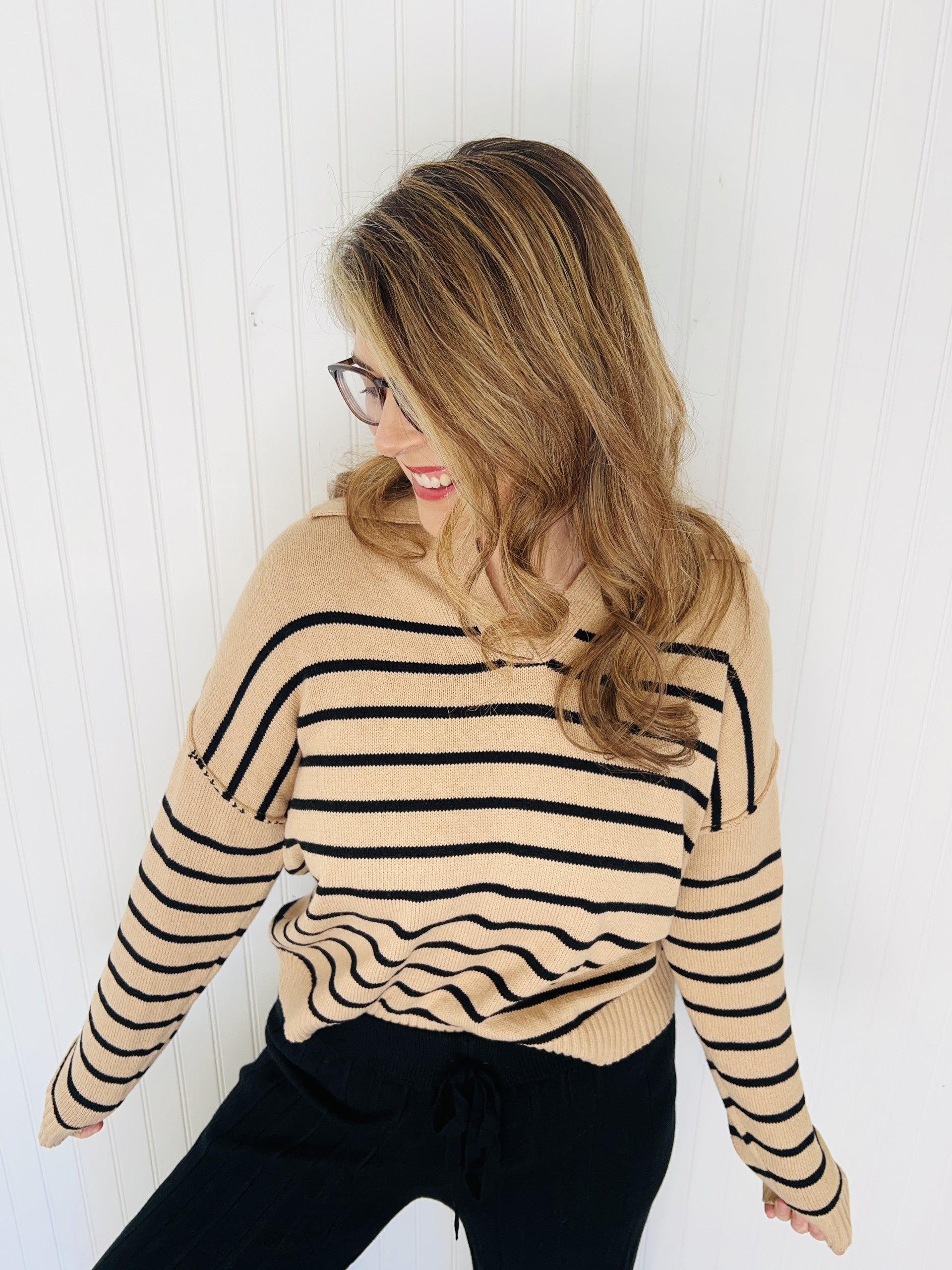 This classic piece features a flattering V-neckline and timeless stripe pattern, making it a versatile addition to your wardrobe. Made from soft, breathable fabric, it's perfect for layering in cooler weather or wearing on its own for a chic, casual look.